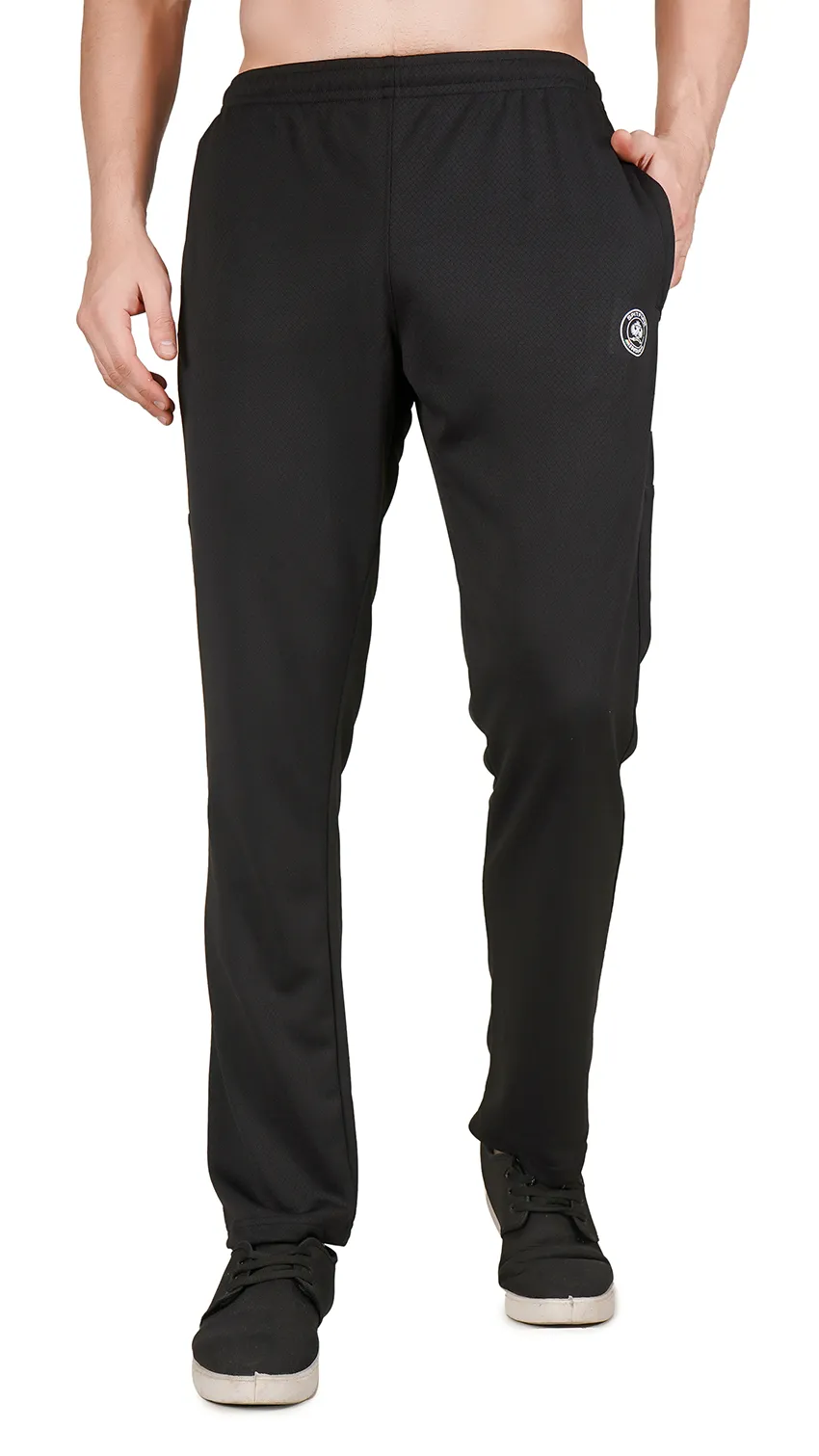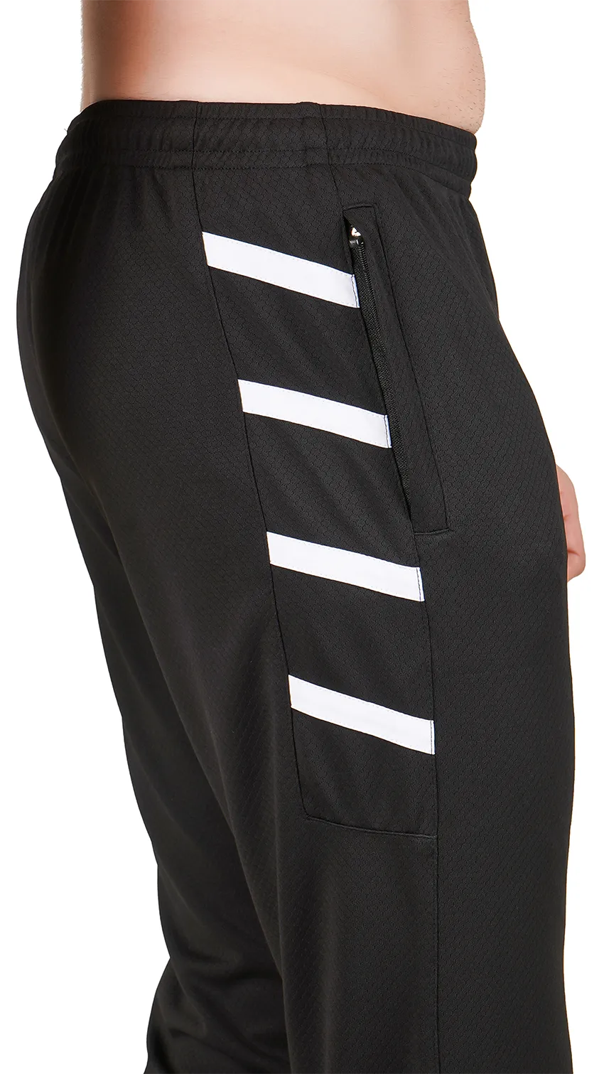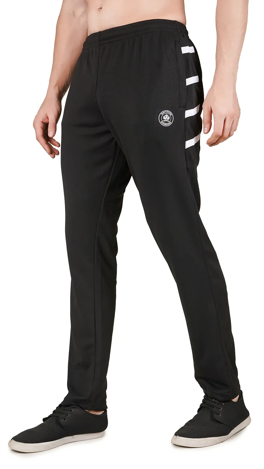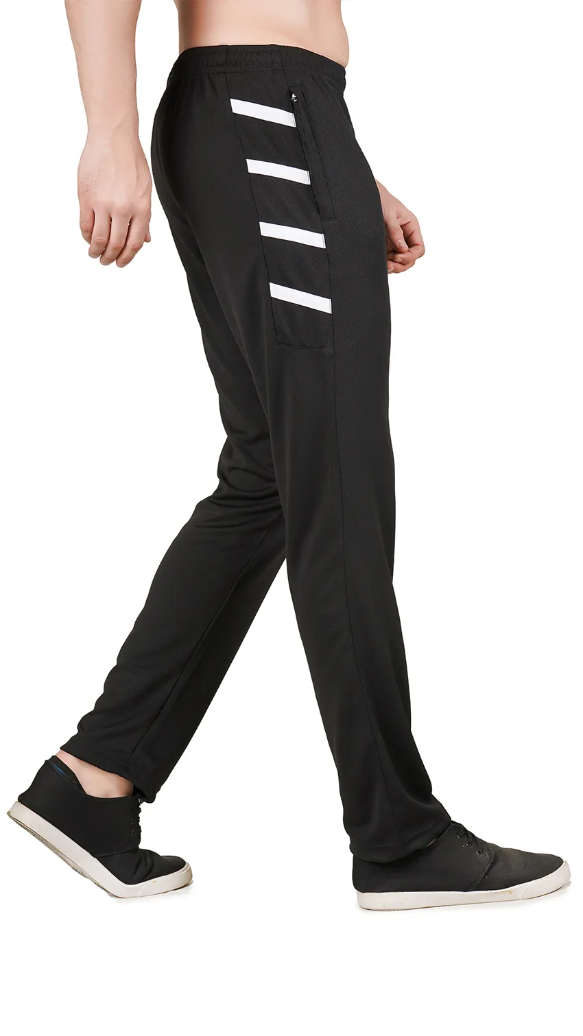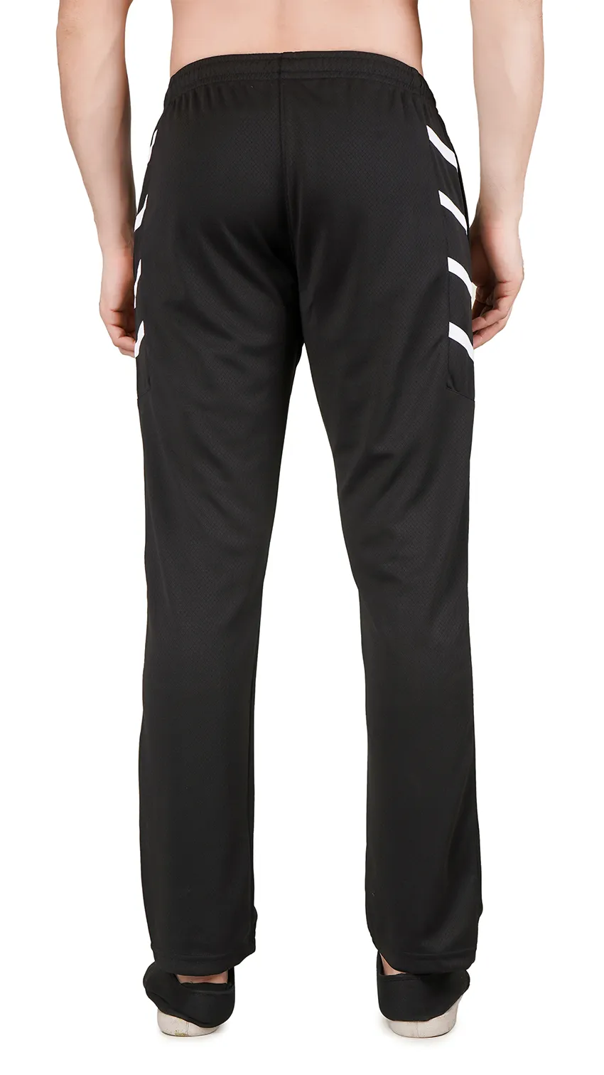 These black sport-style lowers are ideal for an active lifestyle. Featuring three diagonal white stripes on the side pockets, they add a sporty, stylish touch. With a slim-to-regular fit, soft breathable fabric, and practical pockets, they provide comfort and flexibility for workouts, gym sessions, yoga, or casual everyday wear.