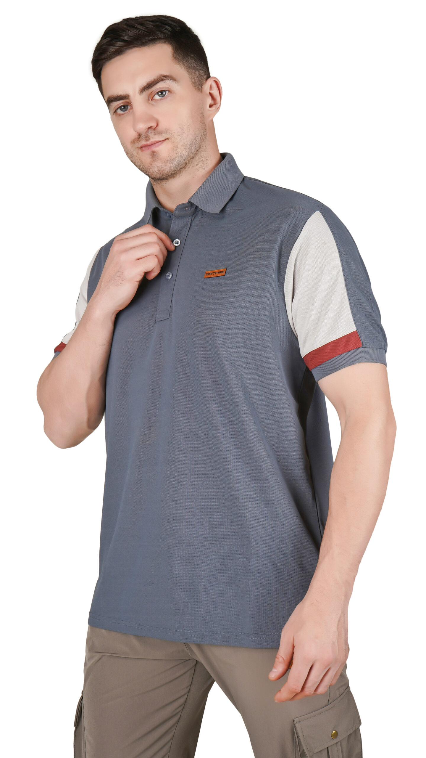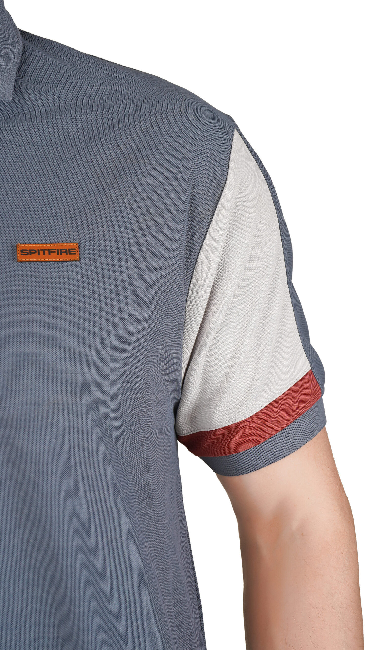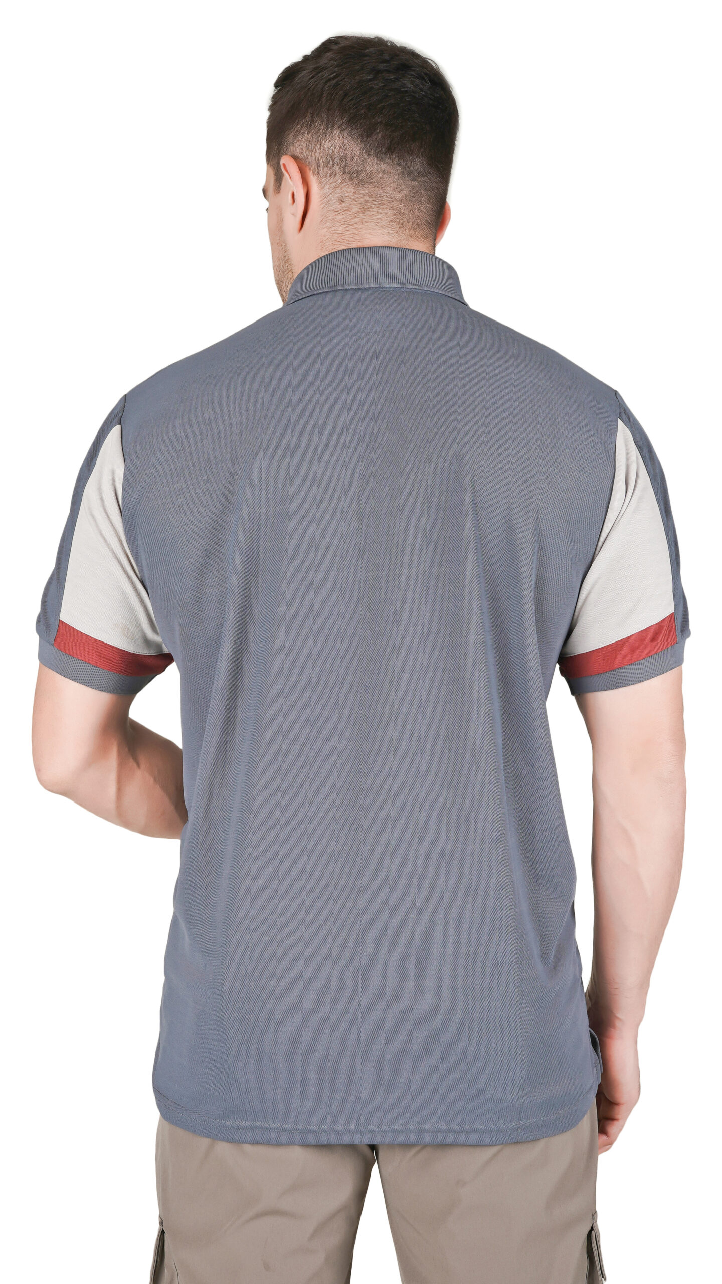 This muted blue-grey polo t-shirt is stylish and comfortable for everyday wear. It features light grey sleeves with a reddish-brown stripe on each cuff and a small matching chest patch for a modern touch. The soft textured body, classic collar, and regular fit make it easy to pair with any casual outfit.