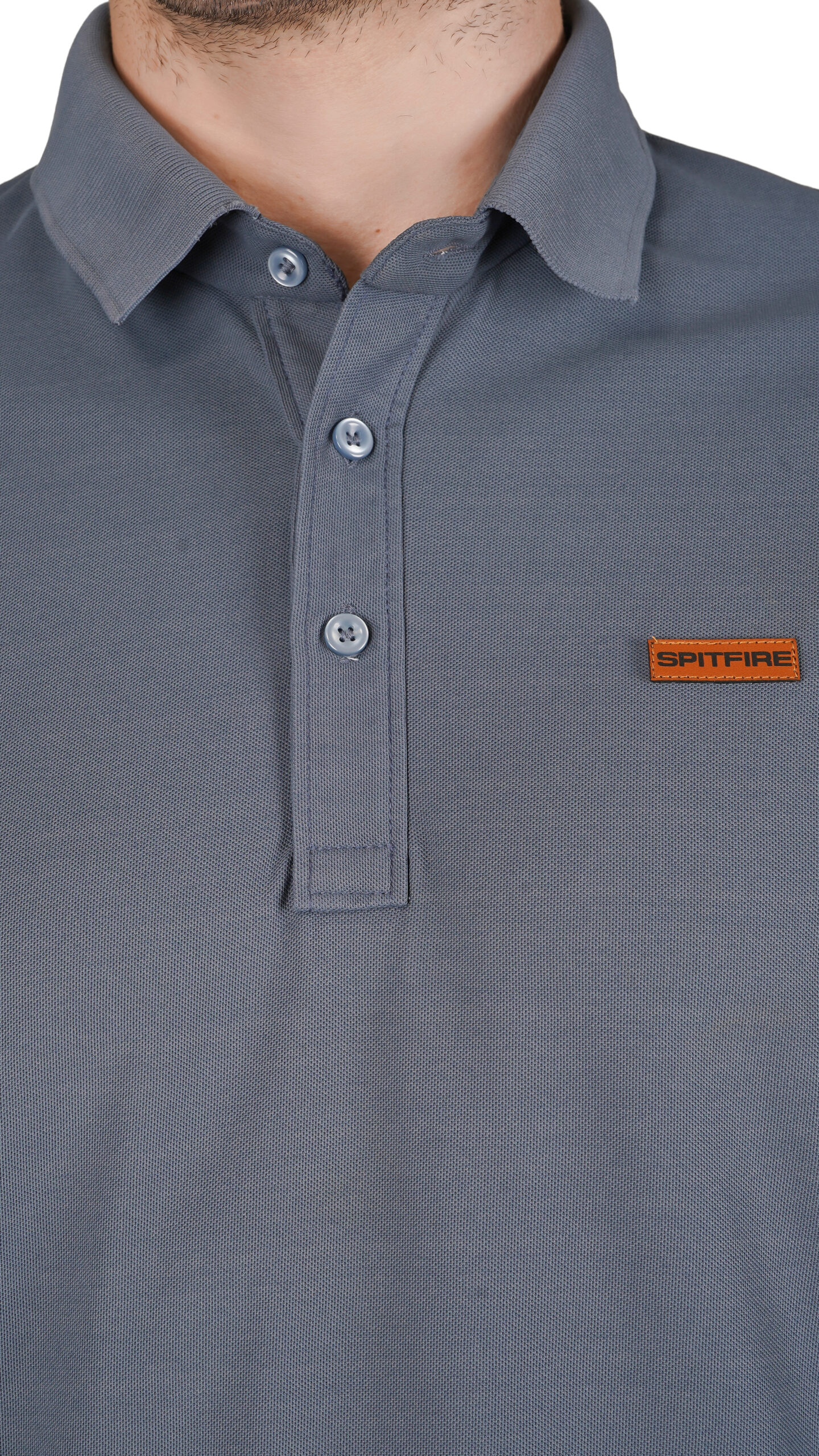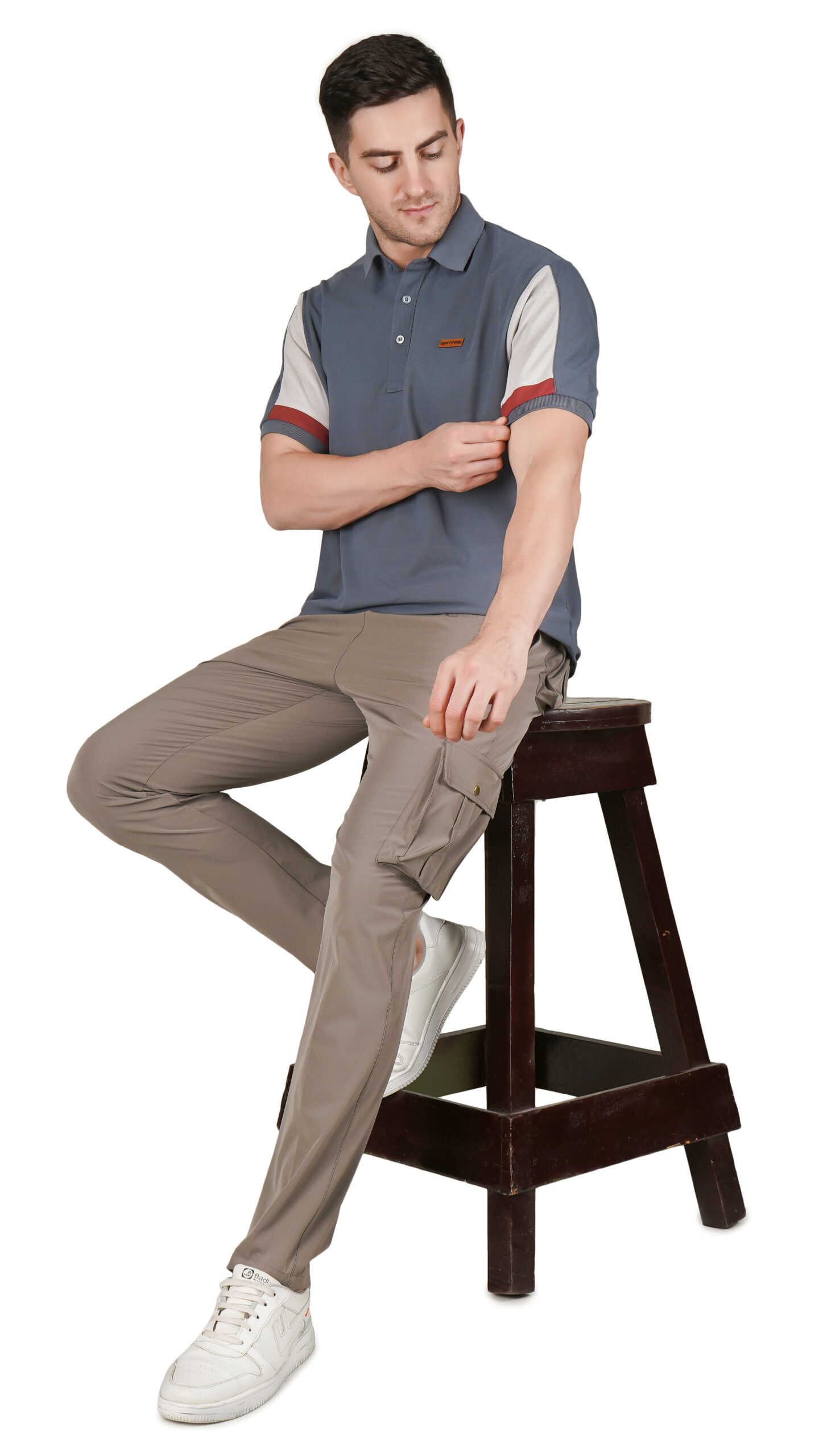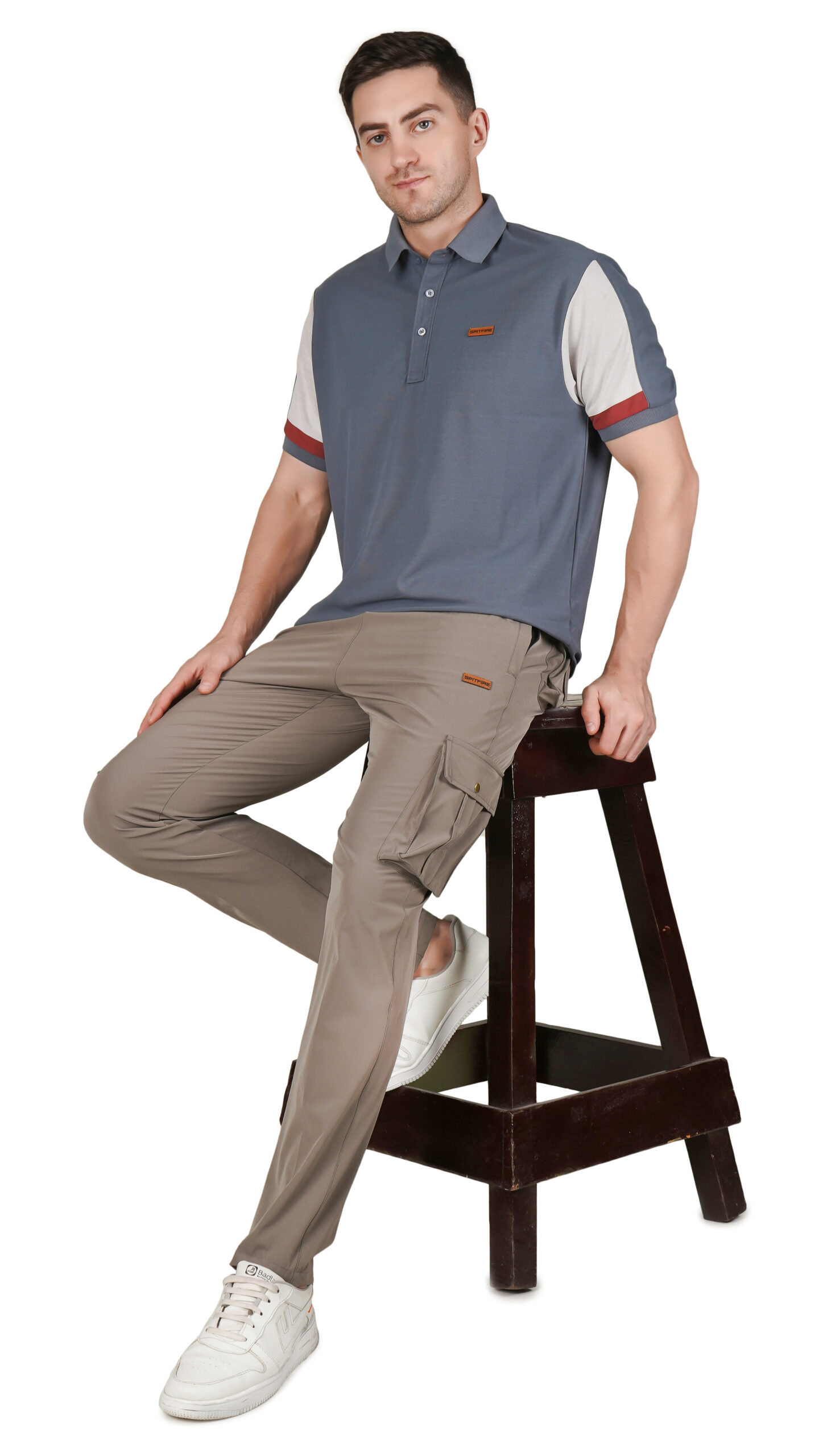 This muted blue-grey polo t-shirt is stylish and comfortable for everyday wear. It features light grey sleeves with a reddish-brown stripe on each cuff and a small matching chest patch for a modern touch. The soft textured body, classic collar, and regular fit make it easy to pair with any casual outfit.